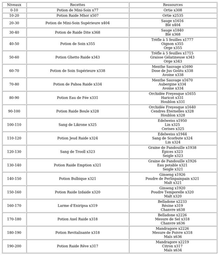 Pour accélérer votre montée en niveau, il est également possible d’opter pour la méthode de la confection, en combinant diverses ressources pour atteindre rapidement le cap 200. Notre guide détaillé vous fournit une table d’expérience (XP) précise ainsi que la quantité exacte de ressources à collecter ou produire.