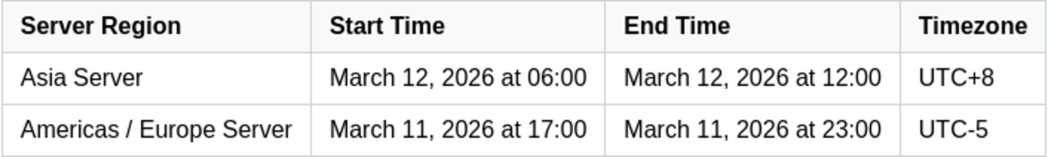 For those on the Americas/Europe servers, the expected completion time is approximately 23:00 (UTC-5) on March 11, 2026.