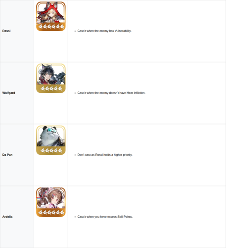 La estrategia central gira en torno a acumular efectos de estado de vulnerabilidad usando a Rossi y Wulfgard, mientras que Da Pan sirve principalmente para consumir estas vulnerabilidades a través de su habilidad de combo, activando el mecanismo de Aplastar para una alta producción de daño.