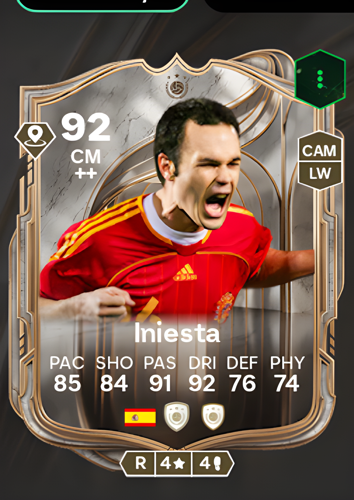 La tarjeta Icono de Andrés Iniesta Luján se destaca como un centrocampista central muy codiciado, con una impresionante calificación general de 92. Con una calificación de ritmo de 85 y regate de 92, Iniesta ofrece una agilidad excepcional y un control cercano, permitiéndole deslizarse más allá de los oponentes en espacios reducidos. Su atributo de pase de 91 asegura una distribución precisa, convirtiéndolo en el corazón creativo de cualquier centro del campo, mientras que su calificación de tiro de 84 significa que es más que capaz de contribuir con goles cruciales desde posiciones más profundas. Aunque su defensa (76) y físico (74) no son sus puntos más fuertes, su destreza técnica y visión hacen de esta tarjeta un cambio de juego, perfecta para orquestar ataques, mantener la posesión y desbloquear defensas con facilidad, dándote la ventaja en momentos críticos en el campo.